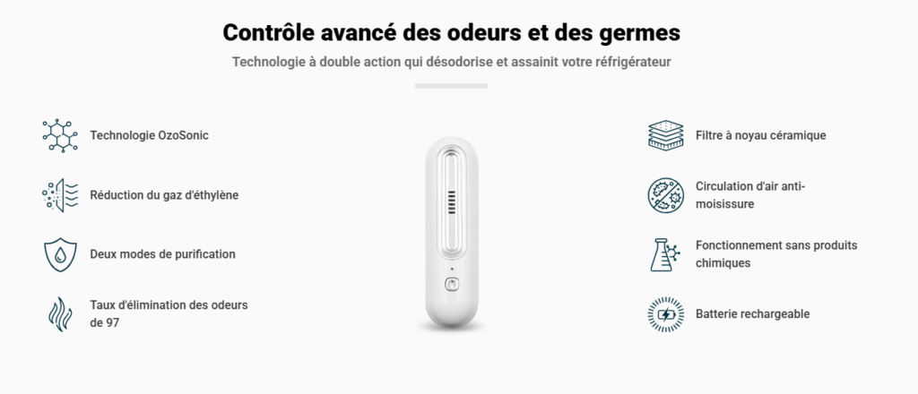 Il utilise une combinaison de technologies avancées, notamment la technologie OzoSonic et la purification photocatalytique, qui agissent directement sur les causes des mauvaises odeurs en décomposant les bactéries, les moisissures et les gaz responsables de la détérioration des aliments.